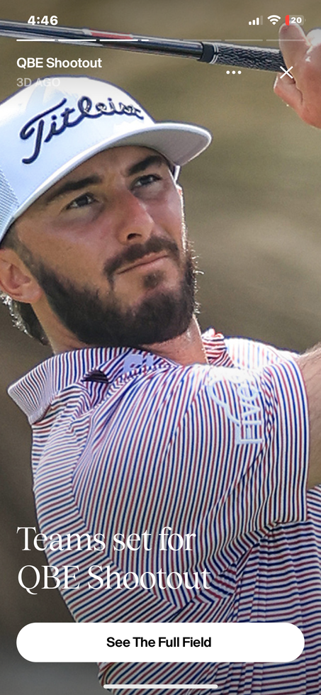 Upon opening the app, the user is greeted with a large image that takes up more than half the screen identifying the feature story of the moment. Just under that is a leaderboard scroll that is intuitive to use. The scroll features the first ten names on the leaderboard, then a button link to access the full leaderboard. What I love about this is that the moment I open the app I know the main story of the day & who is leading the golf tournament. Scroll past the ad to get to the latest news and notice that the leaderboard scroll is sticky to the the top of the screen.